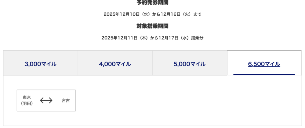 | 沖縄(那覇)⇔石垣 | 6,000マイル |