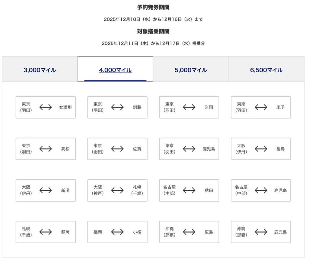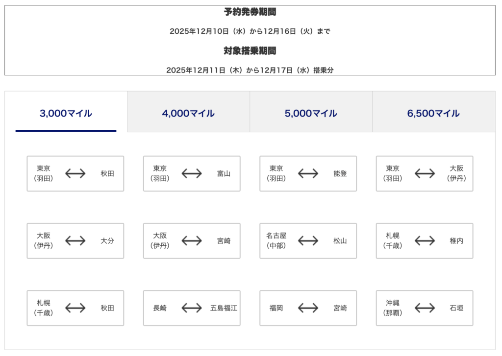 今週のトクたびマイル「来週の対象路線」ー2025年12月11日(木)から12月17日(水)ー
