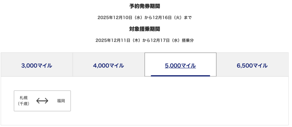 | 札幌(千歳)⇔福岡 | 8,000マイル |